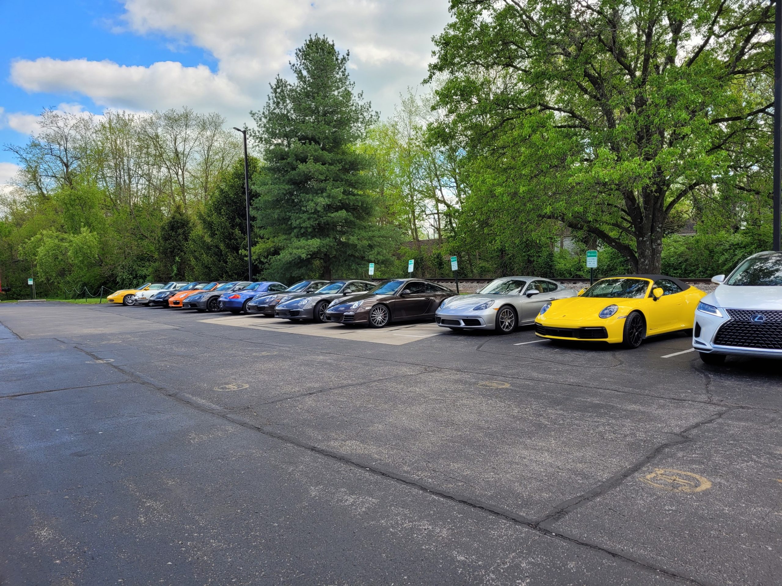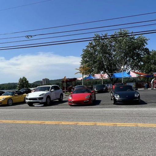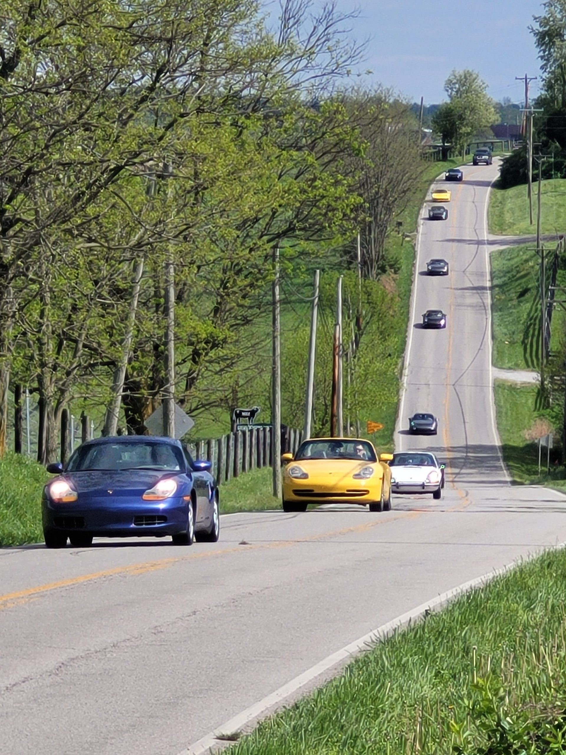 Twenty-Four Bluegrass Region members in twelve Porsches met at the old Waffle House parking lot off of Newtown Pike Sunday afternoon at 3:30 PM. After everyone signed roster and Insurance Waivers and a divers meeting, we lined up and headed out. We were in one group with Larry Dukes in the Lead and Larry McVay in sweep position. Jamie Donaldson left early to set up for a photo of the group on a hill outside of Stamping Ground.