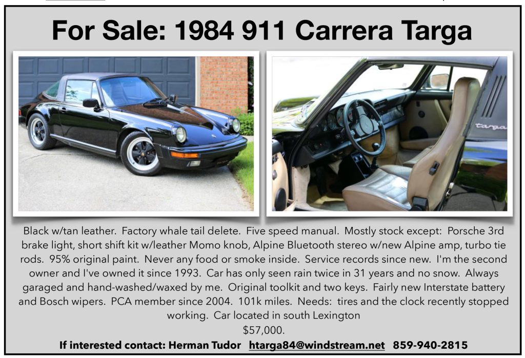 Cars For Sale For Sale: 1984 911 Carrera Targa by bluegrasspca|Published April 7, 2025 If interested contact: Herman Tudor htarga84@windstream.net 859-940-2815 Author: bluegrasspca